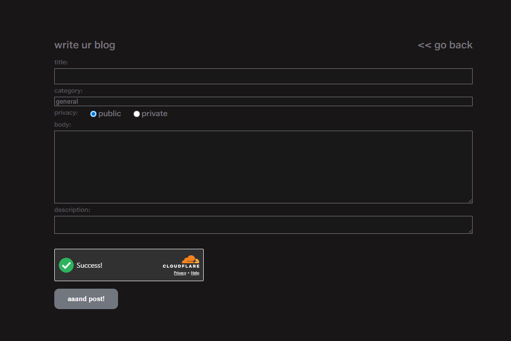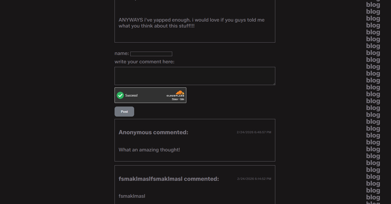 this is all really barebones but i like it that way! also, there is no login required so everything there is anonymous, be it for the best or worst. i did try to plaster cloudflare authentication and cooldowns everywhere to reduce the amount of inevitable spam and attacks that the website would suffer!!